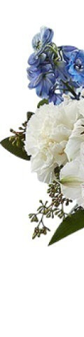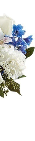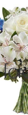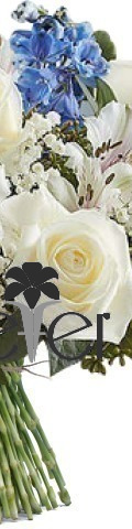 3 x White Roses, 2 x White Carnations, 3 x Blue Delphinium, White Alstroemeria, White Gypsophilia